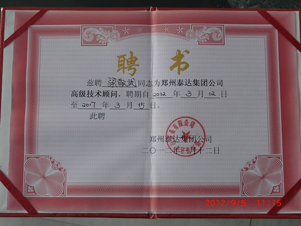 特聘河南省黃金局教授級高級工程師梁敬武先生為我鄭州泰達集團公司高級技術顧問。